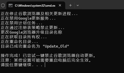 重启是必须的,否则无法正常安装旧版谷歌浏览器! 3、下载并安装旧版谷歌浏览器安装程序 谷歌浏览器旧版安装程序: GoogleChrome117.0.5938.92x64(绿色版).rar:地址1、地址2(Windows10/11 用户选择此版) 下载后直接解压放到C:\Program Files目录下,运行install.bat即可开始使用,不需要进行下面的配置。 GoogleChrome109.0.5414.75x86Enterprise.msi:地址1、地址2(Windows7/8或32位系统 用户选择此版) 下载后执行文件:GoogleChrome109.0.5414.75x86Enterprise.msi,安装完毕后,切勿立即运行谷歌浏览器,要执行完下面这个禁止谷歌浏览器更新脚本后才执行。 4、执行一键禁止谷歌浏览器自动更新bat脚本文件 直接下载:禁止Chrome浏览器更新.rar 解压文件到磁盘上,鼠标右键点击以管理员身份执行: