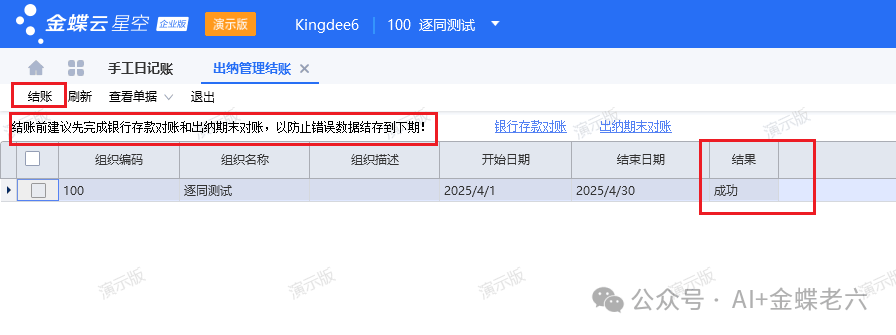 ![]() 七、出纳结账最终分析合理对账差异之后,我们是可以允许合理业务的差异的,如果能完全对平,那也说明是完全按照金蝶的系统规范去进行出纳业务处理,这样是最好的,这样我们就可以进行出纳结账了!出纳结账如下图所示,还是比较简单的。