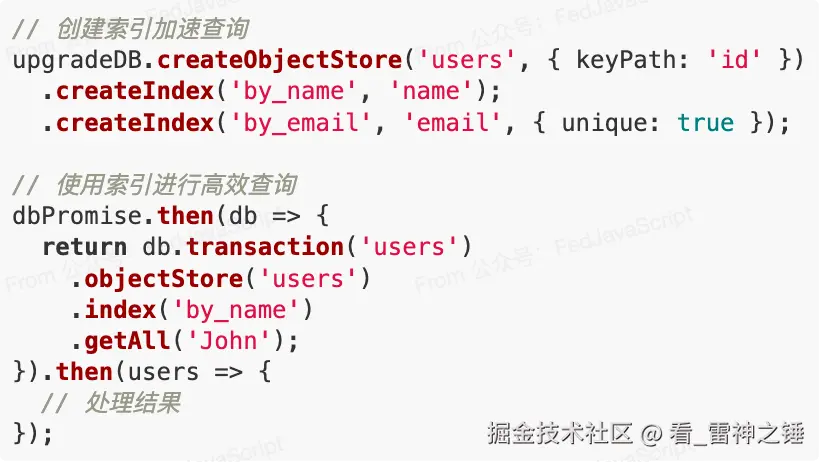 与 localStorage 的简单键值对不同,IndexedDB 提供了类似数据库的高级特性: