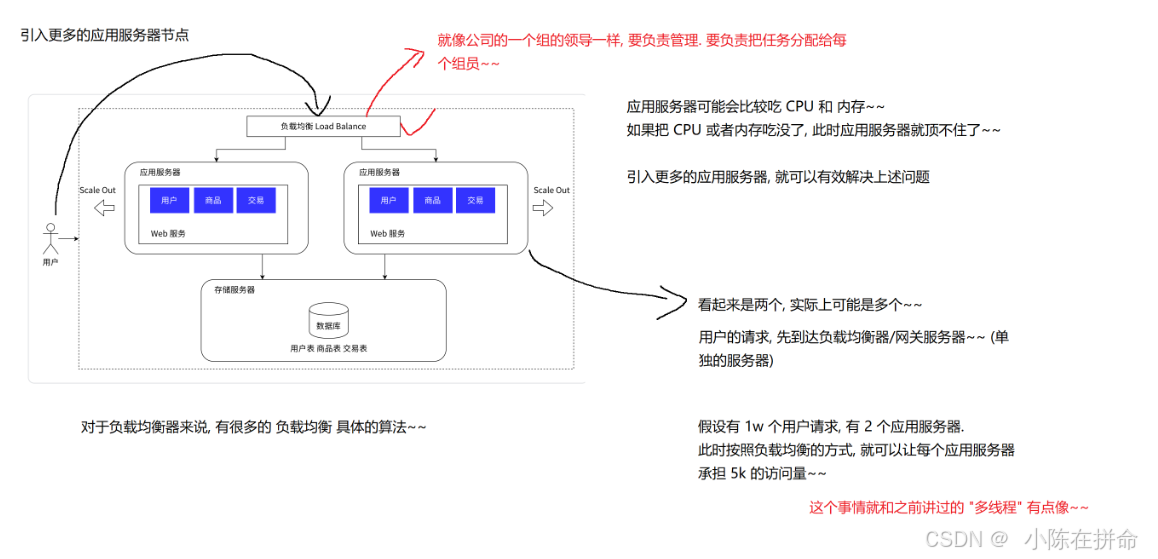 和之前架构的主要区别在于将数据库服务独立部署在同⼀个数据中心的其他服务器上,应⽤服务通过网络访问数据。 2.4 应用服务集群架构我们的系统受到了用户的欢迎,并且出现了爆款,单台应⽤服务器已经⽆法满⾜需求了。我们的单机应⽤服务器⾸先遇到了瓶颈,摆在我们技术团队⾯前的有两种⽅案,⼤家针对⽅案的优劣展示了热烈的讨论: • 垂直扩展/纵向扩展Scale Up。通过购买性能更优、价格更高的应用服务器来应对更多的流量。这种方案的优势在于完全不需要对系统软件做任何的调整;但劣势也很明显:硬件性能和价格的增⻓关系是⾮线性的,意味着选择性能2倍的硬件可能需要花费超过4倍的价格,其次硬件性能提升是 有明显上限的。 • 水平扩展/横向扩展Scale Out。通过调整软件架构,增加应用层硬件,将用户流量分担到不同的 应⽤层服务器上,来提升系统的承载能能。这种⽅案的优势在于成本相对较低,并且提升的上限空 间也很⼤。但劣势是带给系统更多的复杂性,需要技术团队有更丰富的经验。 经过团队的学习、调研和讨论,最终选择了水平扩展的方案,来解决该问题,但这需要引入⼀个新的组件负载均衡:为了解决用户流量向哪台应用服务器分发的问题,需要⼀个专门的系统组件做流 量分发。实际中负载均衡不仅仅指的是工作在应用层的,甚至可能是其他的网络层之中。