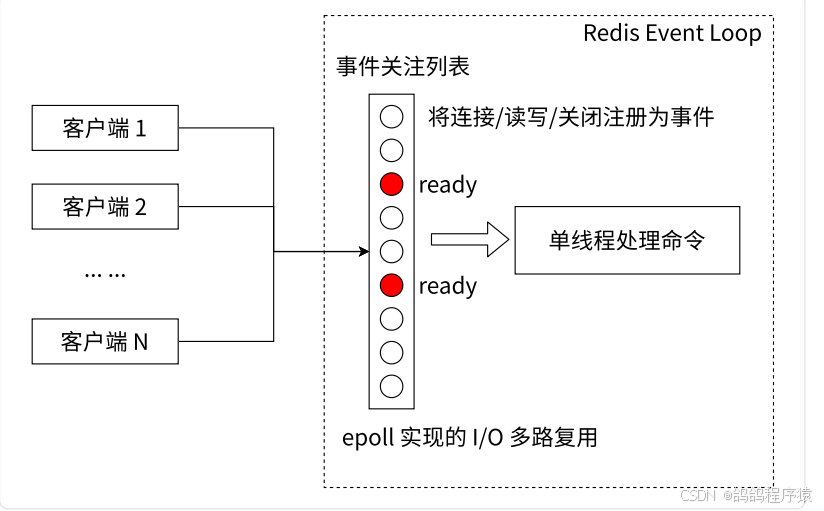 • ⾮阻塞 IO。Redis 使⽤ epoll 作为 I/O 多路复⽤技术的实现,再加上 Redis ⾃⾝的事件处理模型将 epoll 中的连接、读写、关闭都转换为事件,不在⽹络 I/O 上浪费过多的时间.