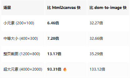📊 数据来源:snapDOM 官方基准测试,测试环境为 headless Chromium,使用真实 DOM 节点。你也可以通过运行 npm run test:benchmark 在本地验证这些数据。