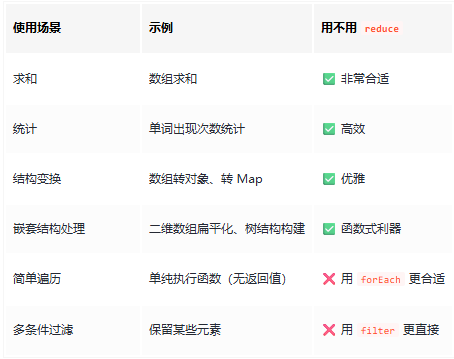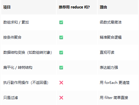 ✅ 当你需要把一个数组“转化”为一个值/对象/结构时,推荐用 reduce