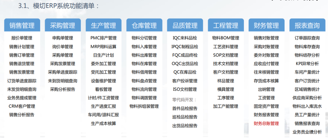 先大致了解模切行业目前面临哪些发展困境,点晴模切ERP系统如何解决这些难题,为模切企业带来更好的经营效率?1、模切料在各部门有不同计量需求,导致各部门信息沟通混乱;2、模切料使用中宽、长不断变化,数据采集困难库存不准,备料 /分切/申购/退料/防呆等仅靠经验预估,效率低浪费大;3、流程可视性差,追溯时效性差,一旦产品出现异常,难以追溯问题缘由;4、手工处理业务数据,易出现信息断层,造成产品质量低、货期超时等严重的生产事故;5、财务核算模块独立于ERP管理系统之外,财务管理程度有限,分析报告滞后;6、内外部需求不断变化,传统ERP系统功能僵化、无法更改。那么针对以上管理痛点,点晴模切ERP系统解决方案如下点晴模切ERP系统从2004年开始研发并不断完善模切ERP系统,18年以上经验累积,专为模切企 业提供了一整套的信息化解决方案,包括销售管理、采购管理、 生产管理(MRP/排产/制程管控)、仓库管理(原辅料/成品/ 刀模)、工程管理( BOM/工艺/样品)、品质管理、财务管理 (对账/存货核算/总账)等,并支持手机/手持终端实时在线操 作,最大程度贴近模切行业的实际需求。