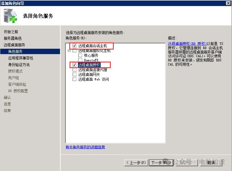 选择角色服务:”远程桌面会话主机“和”远程桌面授权“,下一步