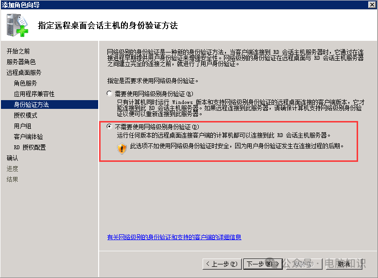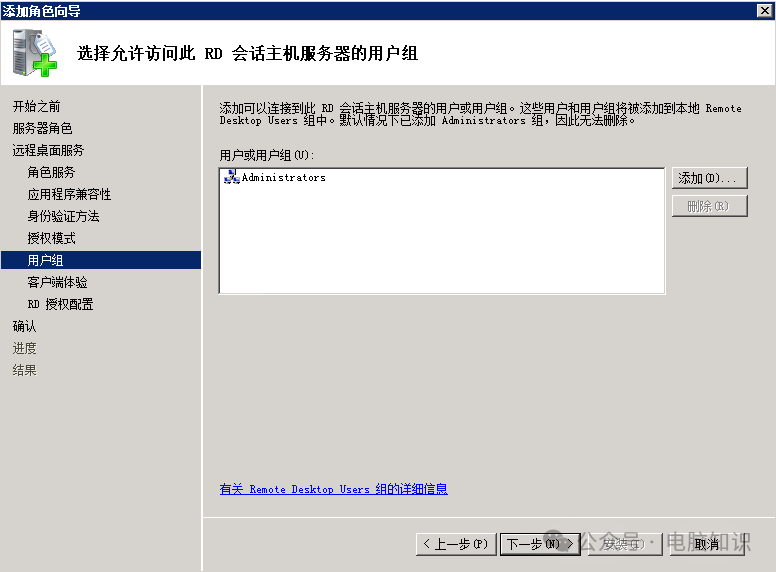 默认情况只有Adminisstratrors组可以连接到RD会话主机服务器(如果有特别需要请添加需要的用用户或组),下一步