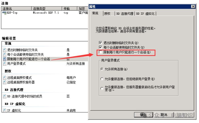 在右侧窗口中双击”限制每个用户只能进行一个会话“,在”属性“中取消勾选”限制每个用户只能进行一个会话“,确定
