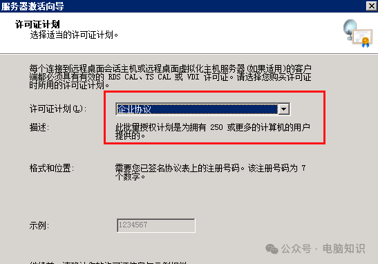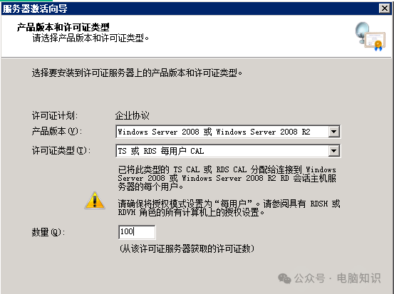 产品版本:”windows server 2008或windows server 2008 r2“,许可证类型:”TS或RDS每用户CAL“,数量:输入你想允许的最大远程连接数量,下一步