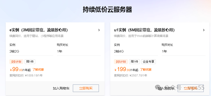阿里云轻量应用服务器和云服务器怎么样?2025年阿里云最便宜的vps云服务器汇总,价格最为便宜的轻量应用服务器有2核2G价格为68元1年;2核4G4M 60GB高效云盘,价格为298元1年;经济型e实例2核2G,40G ESSD Entry盘,3M带宽,价格为99元1年;通用算力型u1实例2核4G,80G ESSD Entry盘,5M带宽,价格为199元1年。这个价格是2025年截至目前阿里云的活动中价格最低的几款云服务器产品了,那么这两款款轻量应用服务器和云服务器怎么样?作为用户的我们应该如何选择呢?本文将详细解析阿里云目前最便宜的几款云服务器产品,包括轻量应用服务器和特价云服务器实例,帮助用户更好地了解并选择适合自己的云服务器。 阿里云官网活动地址:https://vps55.com/www/aliyun-vps 一、轻量应用服务器阿里云轻量应用服务器:购买直达 产品概述轻量应用服务器(Simple Application Server)是阿里云推出的一款面向个人开发者、小微企业及学生用户的高性价比云服务器产品。它提供了快速部署、易于管理和丰富的镜像选择等特点,非常适合搭建个人网站、小型应用或进行开发测试。 价格与配置根据最新信息,阿里云轻量应用服务器提供了多款低价配置选项。其中,2核2G配置的轻量应用服务器,新用户首年价格低至68元。对于个人用户和小型企业来说,完全能够满足基本的网站和应用部署需求。 此外,阿里云还经常推出优惠活动,如新用户专享优惠、续费优惠等,进一步降低了用户的使用成本。 优势分析