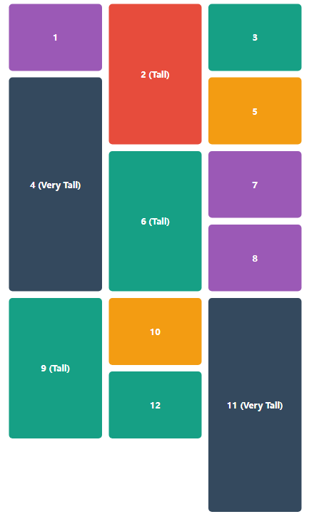 使用 grid-auto-rows 和 span 关键字创建高度不一的卡片布局。一个不均匀的网格布局,有些卡片较高,有些较矮,形成了类似瀑布流的效果。用grid-auto-rows 设置了基础行高,而 grid-row: span X 让某些项目跨越多个行轨道。repeat(auto-fit, minmax(200px, 1fr)) 确保了布局是响应式的。