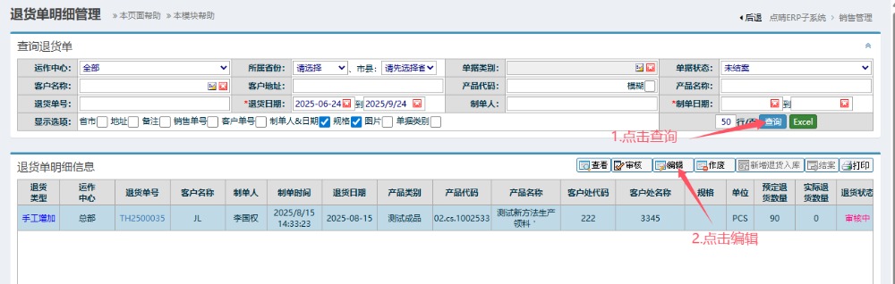 2.进入界面后,按图操作:先点击查询,然后找到对应退货单点击编辑