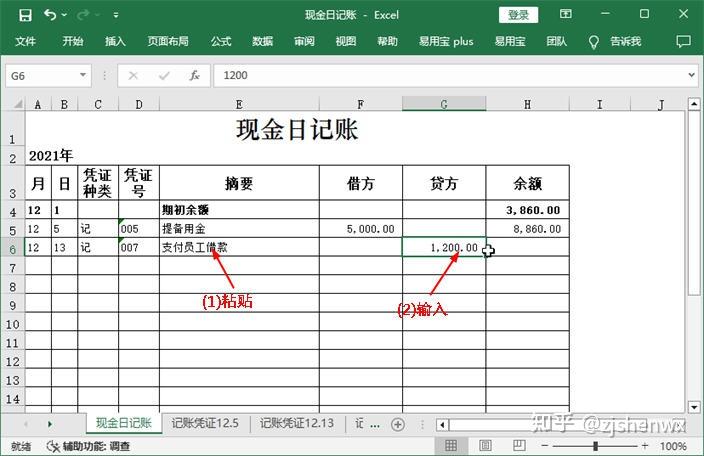 (1)再次切换回“现金日记账”工作表;(2)选中E5单元格,在编辑栏中粘贴复制的摘要;(3)在F5单元格中输入“库存现金”科目的借方发生额。