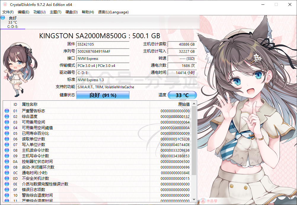 这是一位日本开发者开发的专业硬盘健康状态信息检测工具,专为检查 HDD 机械硬盘和 SSD 固态硬盘的状态而设计。 本次分享迷提供两个版本:一个是标准版,另一个是 Aoi 版。两者都是单文件版本,无需安装,下载后直接运行即可使用! 官网地址:https://crystaldiskinfo.org/ 下载地址:https://pan.xunlei.com/s/VOXzSvzfrI0BDzs2JVKDuzmpA1?pwd=pp4k https://crystalmark.info/en/download/ 标准版  Aoi版  CrystalDiskInfo可以全面、详细、直观地了解硬盘健康状态和各种参数,包含硬盘温度、序列号、驱动器接口、通电时间、通电次数等。比如可通过通电次数及通电时间辨认是否为旧盘或海鲜货。 软件还会根据S.M.A.R.T的评分做出评估,当硬盘快要损坏时还会发出警报。 除此之外,还能实时监控硬盘温度,防止过热导致硬件损坏和数据丢失。 在硬盘类型的支持上面,无论是传统的 IDE(并行 ATA)、串行 ATA 硬盘,还是新型的 NVMe 硬盘,CrystalDiskInfo 都能很好地支持。部分 USB 连接的硬盘和 Intel RAID 配置也在其支持范围内,兼容性强,适用各类用户的不同存储设备。 可以说是非常好的验盘工具,非常推荐大家使用! 该文章在 2025/10/10 16:55:07 编辑过 | 关键字查询 相关文章 正在查询... |