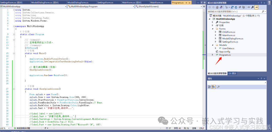 using System;using System.Collections.Generic;using System.Linq;using System.Threading.Tasks;using System.Windows.Forms;namespace MultiWindowApp{    static class Program    {        /// <summary>        /// 应用程序的主入口点。        /// </summary>        [STAThread]        static void Main()        {            Application.EnableVisualStyles();            Application.SetCompatibleTextRenderingDefault(false);            // 显示启动画面(可选)            ShowSplashScreen();            Application.Run(new MainForm());        }        static void ShowSplashScreen()        {            Form splash = new Form();            splash.Size = new System.Drawing.Size(300200);            splash.StartPosition = FormStartPosition.CenterScreen;            splash.FormBorderStyle = FormBorderStyle.FixedSingle;// None;            splash.BackColor = System.Drawing.Color.LightBlue;            splash.Text = "多窗口应用,启动中...";            //Label label = new Label();            //label.Text = "多窗口应用,启动中...";            //label.TextAlign = System.Drawing.ContentAlignment.MiddleCenter;            //label.Dock = DockStyle.Top;// Fill;            //label.Font = new System.Drawing.Font("Microsoft C#", 16F);            //splash.Controls.Add(label);            splash.Show();            // 显示10秒            System.Threading.Thread.Sleep(10000);            splash.Close();        }    }}