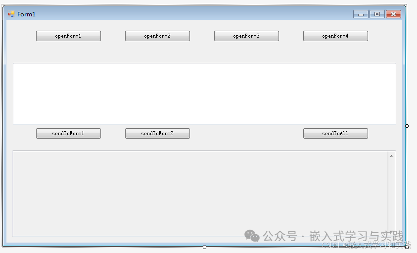 using System;using System.Collections.Generic;using System.ComponentModel;using System.Data;using System.Drawing;using System.Linq;using System.Text;using System.Threading.Tasks;using System.Windows.Forms;namespace MultiWindowCommunication.Forms{    public partial class ChildForm3 : Form    {        // 定义委托        private Action<string> _callback;        public ChildForm3()        {            InitializeComponent();        }        // 设置回调函数        public void SetCallback(Action<string> callback)        {            _callback = callback;        }        private void btnSendToMain_Click(object sender, EventArgs e)        {            if (!string.IsNullOrEmpty(txtMessage.Text) && _callback != null)            {                // 通过委托向主窗口发送消息                _callback(txtMessage.Text);                txtMessage.Clear();            }        }    }}
