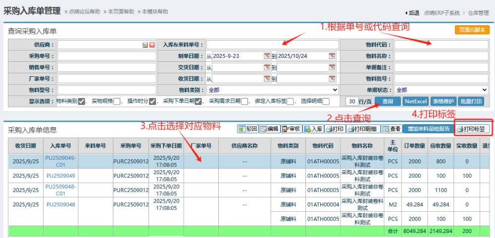 2.进入界面后,按图操作:根据单号或者代码查询,点击查询。然后点击对应物料,打印标签。
