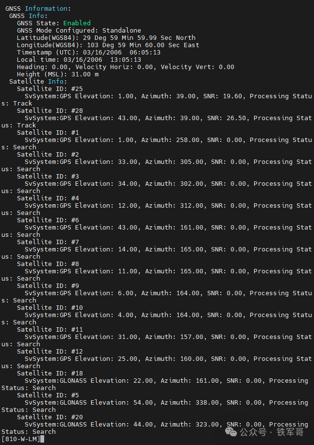 可以看到,卫星信号全部丢失,但是显示的经纬度和高度还是之前一样,难道这个值是初始配置?