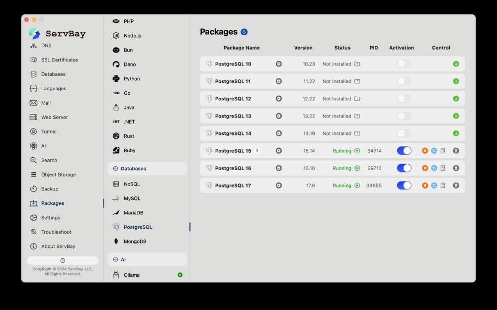 做出选择的关键在于清晰地认识项目需求。而借助ServBay这样的现代化开发工具,一键安装MySQL和PostgreSQL。