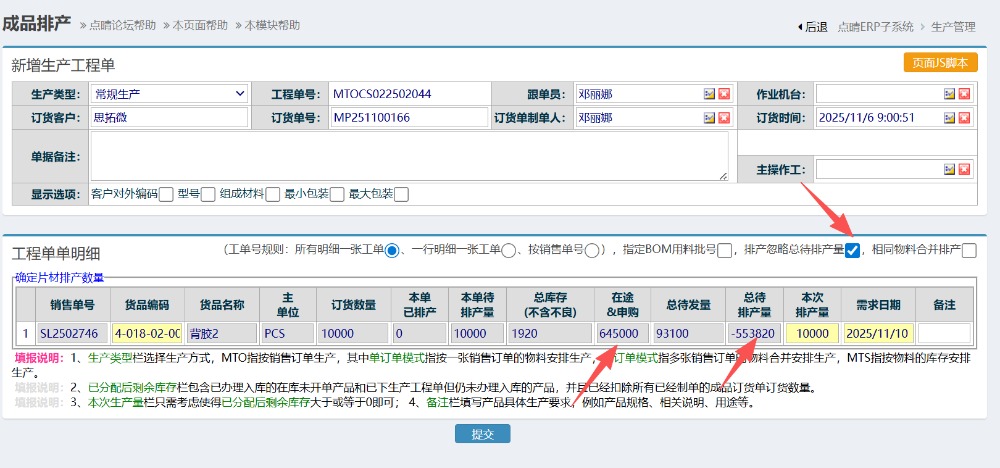 还有,要注意在排产界面上尽量不要勾选第一个按钮,会导致明细只会汇总在一张单上。