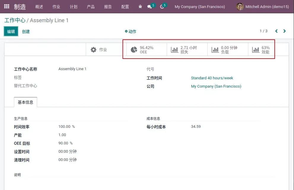 工作中心根据已完成的工单自动记录效率数据,提供整体设备效率(OEE)等有用指标。并且记录工人在制造活动上花费的确切时间,提供有价值的成本信息和生产效率洞察: